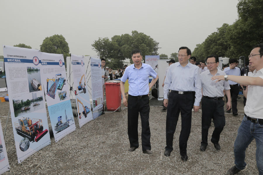 5月29日,江蘇省農(nóng)機(jī)產(chǎn)品推進(jìn)會(huì)在太倉(cāng)現(xiàn)代農(nóng)業(yè)園舉行。江蘇省副省長(zhǎng)繆瑞林參觀了省水機(jī)公司水利機(jī)械產(chǎn)品推介展區(qū),對(duì)水機(jī)公司大力開發(fā)環(huán)保清淤產(chǎn)品表示贊許。
