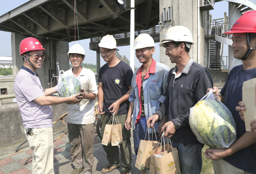 7月25日,水機公司黨委書記田建京、工會主席黃統(tǒng)及相關(guān)項目負責(zé)人一行8人前往芒稻閘、邵仙閘項目施工現(xiàn)場開展 “送清涼”活動,慰問戰(zhàn)斗在高溫酷暑下的一線員工,送去防暑降溫用品、西瓜和慰問金,囑托現(xiàn)場員工注意施工安全,合理調(diào)整作息時間,采取必要的防暑降溫措施,團結(jié)一心,攻堅克難,確保優(yōu)質(zhì)高效地完成項目施工任務(wù)。
