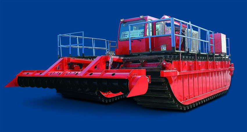 XWQY100型兩棲旋挖式清淤機(jī)是應(yīng)用戶要求而專門(mén)設(shè)計(jì)的一種大型池塘水下清淤機(jī)械。該機(jī)以浮箱履帶為基礎(chǔ)實(shí)施工作移位,用旋挖頭切割和收集水下淤泥,用泥漿泵將泥漿吸走并排出,送到指定的排泥場(chǎng),從而實(shí)現(xiàn)對(duì)大型池塘清淤的目的。 該機(jī)也可用于其他具有相似條件的河道、溝渠等淺水水域進(jìn)行清淤作業(yè)。